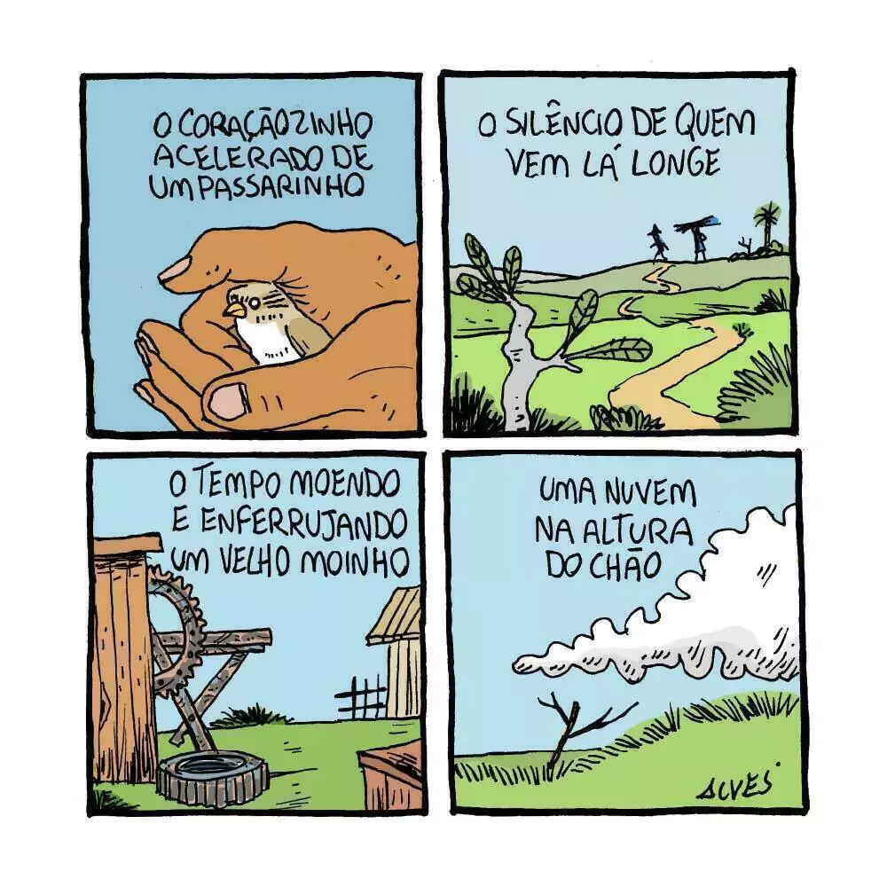 “Costumo explicar que a obra está na fronteira entre o poema e os quadrinhos. Podem ser poemas quadrinizados ou quadrinhos poemados”, brinca o autor.